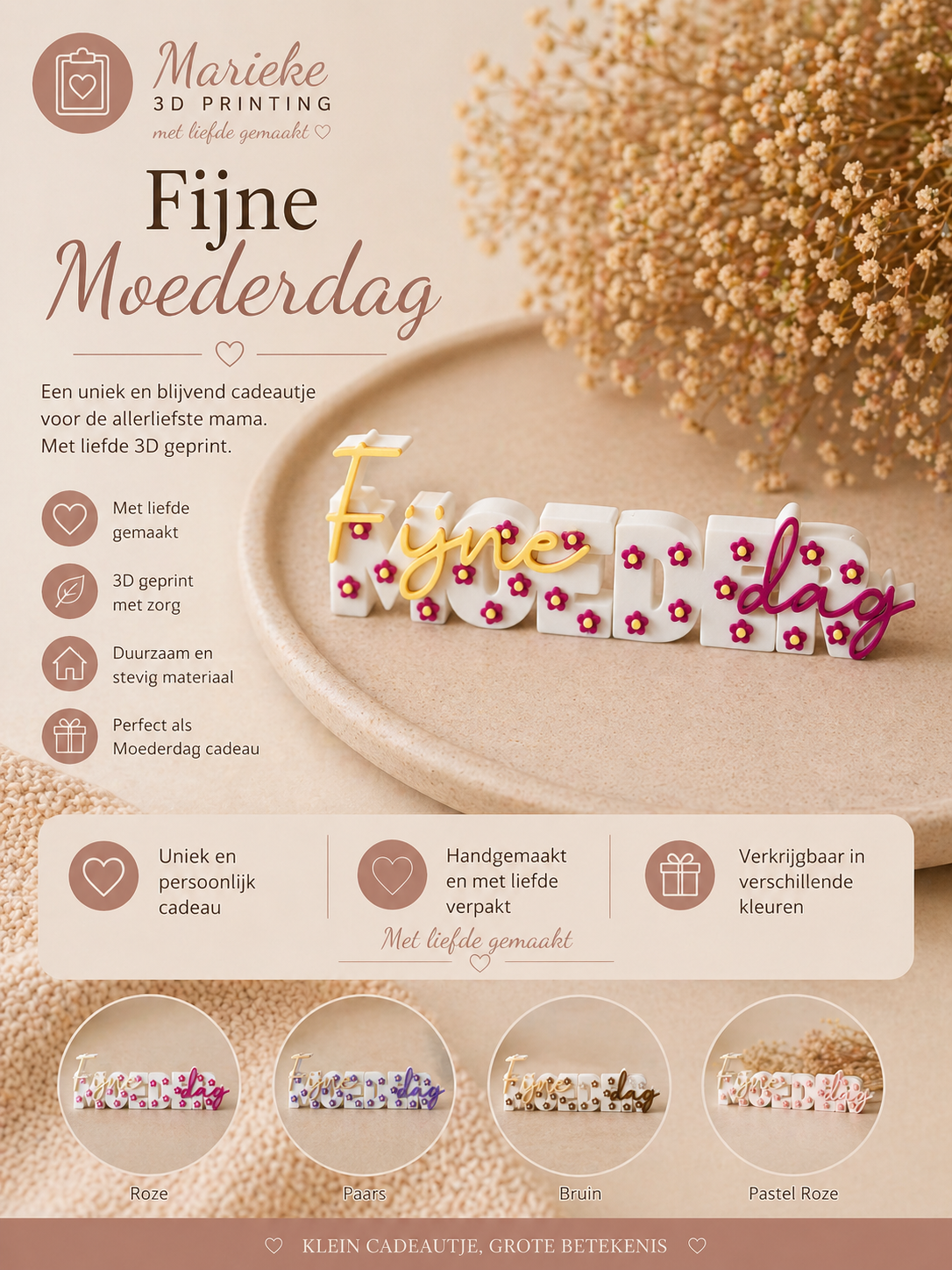 Dit prachtige 3D geprinte decoratiestuk met de tekst “Fijne moederdag” is een liefdevol gebaar voor iemand die heel speciaal voor je is.